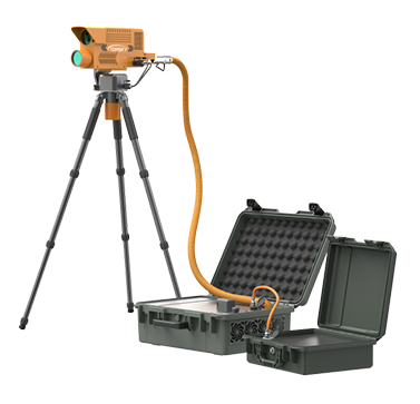 光學(xué)破拆裝置內(nèi)置高能光纖激光器,能夠從地面發(fā)射激光對鋼板、鋁板、鋼筋、彩鋼瓦、樹木、塑料、馬蜂窩等進行遠距離切割清除。