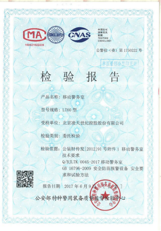 我司的移動(dòng)警務(wù)室取得了公安部特種警用裝備質(zhì)量監(jiān)督檢驗(yàn)中心的檢驗(yàn)報(bào)告。