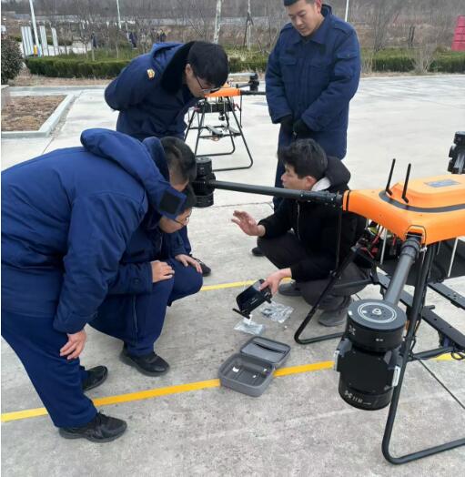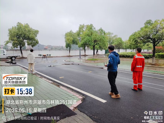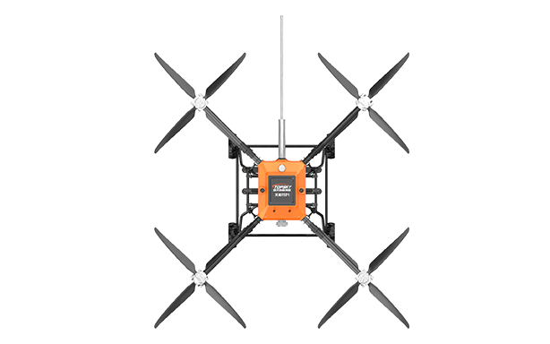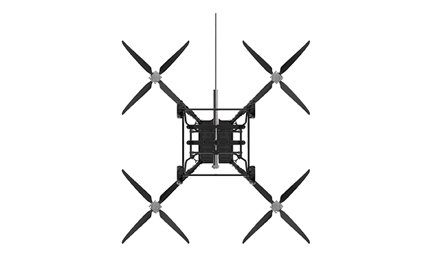 該無人機(jī)可裝載在消防車上,能快速啟動升空,通過特制高壓水帶與消防車水罐連接,消防車水罐內(nèi)部高效泡沫/水基滅火劑輸送到無人機(jī)平臺,在水槍噴口水平噴射出去,達(dá)到滅火的效果。