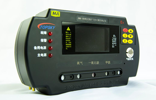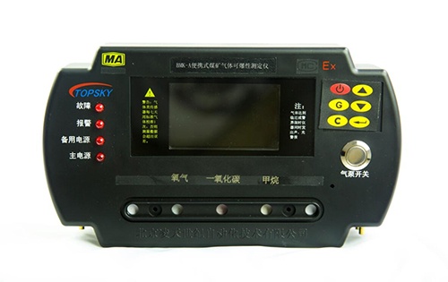 BMK-A便攜式煤礦氣體可爆性測定儀(以下簡稱測爆儀),是用于煤礦井下使用的礦用本安兼隔爆型攜帶式儀器。測爆儀用于煤礦井下,由礦山救護隊員攜帶進入災區(qū),監(jiān)視作業(yè)環(huán)境周圍氣體組份是否存在爆炸危險。也可由消火人員攜帶,在處理自然發(fā)火或啟封火區(qū)過程中,檢測周圍環(huán)境或密閉內(nèi)空氣中甲烷、氧的濃度值,在儀器液晶顯示屏上直接顯示出O2、CH4、CO的濃度值和環(huán)境溫度值,并顯示出“爆炸三角形”的圖形及各氣體組份所構成的坐標點,臨近或達到警界限時儀器同時發(fā)出聲、光警報。