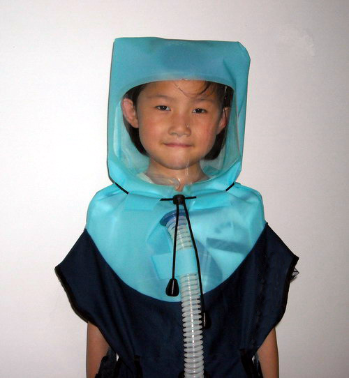 適合兒童(3—8歲)使用,為有效回避戰(zhàn)爭(zhēng)毒氣或有害環(huán)境而設(shè)計(jì)的防毒面罩。利用送風(fēng)機(jī)將外部空氣通過(guò)濾毒罐送入頭罩內(nèi),形成密閉正壓,使得呼吸方便,活動(dòng)無(wú)不適現(xiàn)象。