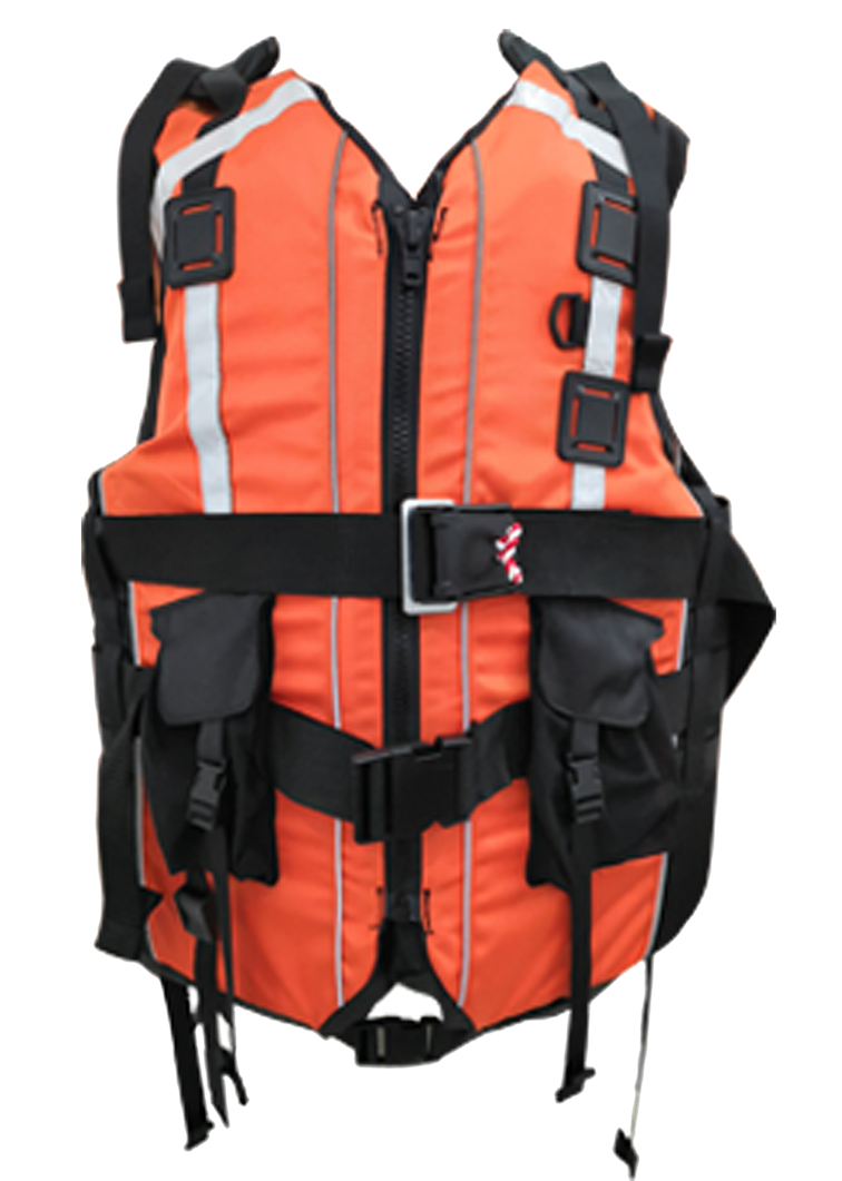救生衣的面料采用方形針織壓力點(diǎn)和1680D材質(zhì)的Cordura?面料,使得救生衣足夠應(yīng)對(duì)復(fù)雜的水域活動(dòng)。采用背心式設(shè)計(jì),胸襟采用YKK塑鋼開口拉鏈,并使用塑料拉頭浮力片固定于布料夾層內(nèi),后領(lǐng)口增加手提式松緊提拉帶設(shè)計(jì),方便于攜帶。