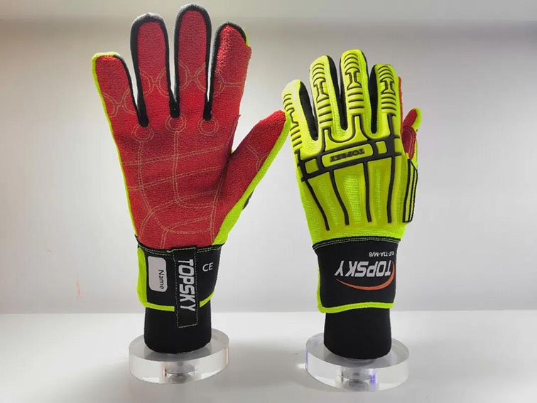 采用3D立體設(shè)計,符合人體手型自然彎曲,手掌指尖一片式翻轉(zhuǎn)手指背,主體顏色為橘紅色和黃色,主要材質(zhì)為牛皮和芳綸雙面針織布,總體性能符合《GA633-2006消防員搶險救援服裝》的標準。