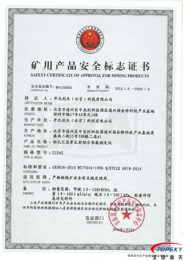 3測(cè)定儀的本安參數(shù): Ui: DC19.2V,Ii:250mA, Ci:0uF, Li: 0mH。