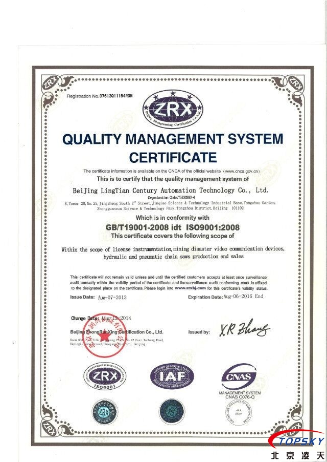 經(jīng)過嚴格的評審,我司近期按照GB/T19001-2008質(zhì)量管理體系要求,已經(jīng)取得ISO9001質(zhì)量管理體系認證,認證的獲得,標志著我司在管理體系上已經(jīng)具備較高水平。認證證書的中英文如下: