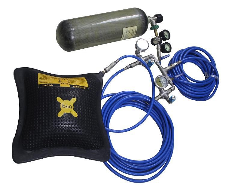 高壓氣瓶通過壓力調節(jié)器(減壓閥)的減壓,將25MPa的高壓空氣降低到0.8MPa低壓空氣,0.8MPa低壓空氣通過雙向控制器連接兩個氣墊或兩個氣囊,可完成兩組起重操作??刂破饔呻p向控制器和單向控制器兩種類型,顧名思義,雙向控制器可連接兩個氣墊或兩個氣囊,單向控制器可連接1個氣墊或1個氣囊。氣囊與氣墊的區(qū)別為,氣囊起重力小,起重高度高,氣墊剛好相反。